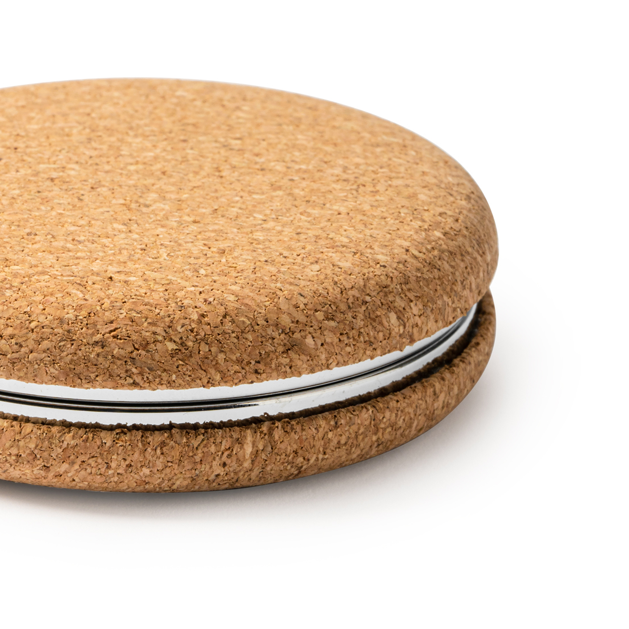 Espejo plegable de bolsillo realizado en corcho natural y metal cromado, compuesto por dos espejos, uno normal y otro de aumento.