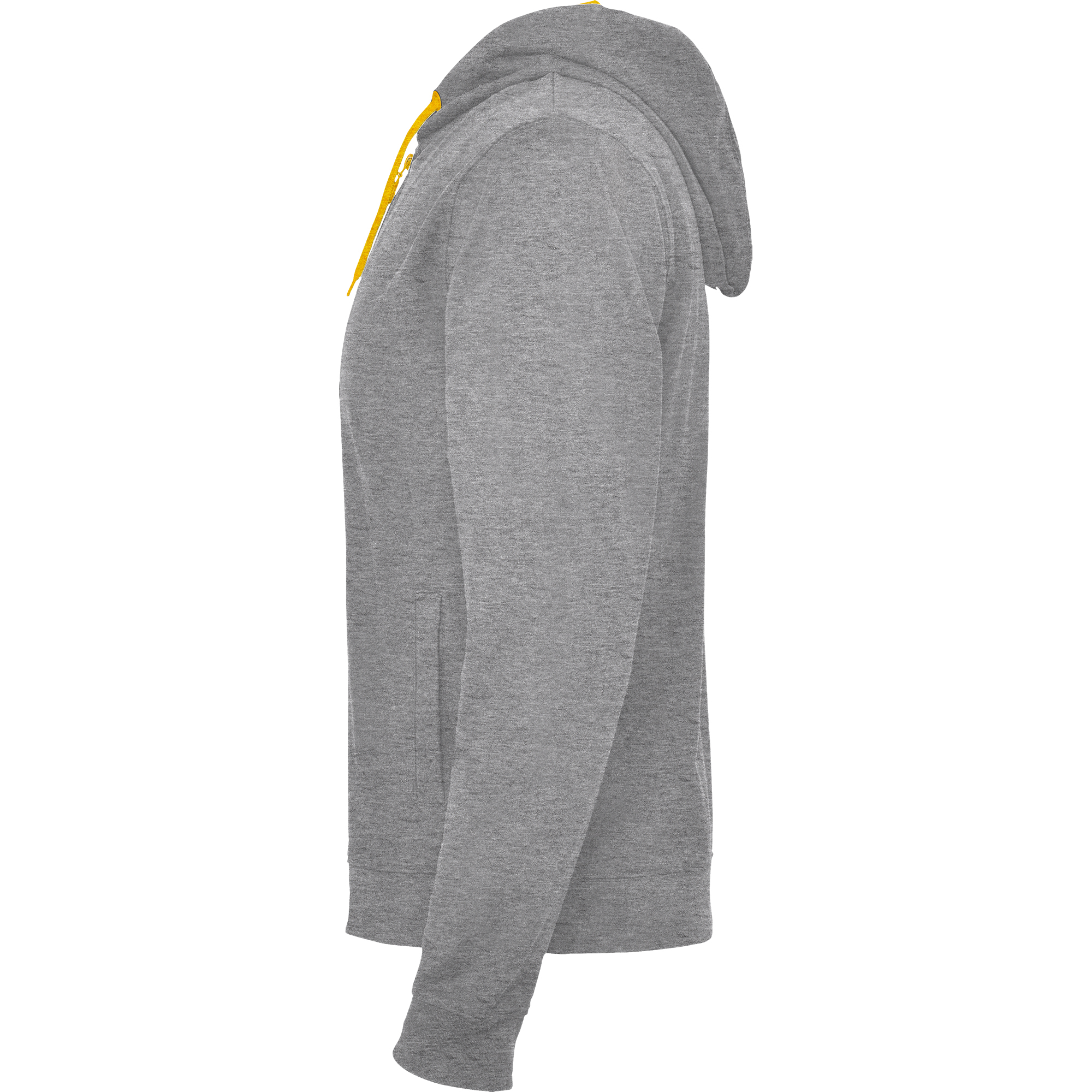 Sudadera de felpa no perchada con detalles en color flúor. Cremallera central con tirador en contraste color flúor. Capucha con forro interior en tejido de poliéster microperforado en contraste color flúor, con cordón y ojales metálicos en contraste color flúor. Manga larga con puño y cintura en punto canalé 1×1. Dos bolsillos frontales con vivo ancho. Cubrecosturas reforzado en el interior del cuello.