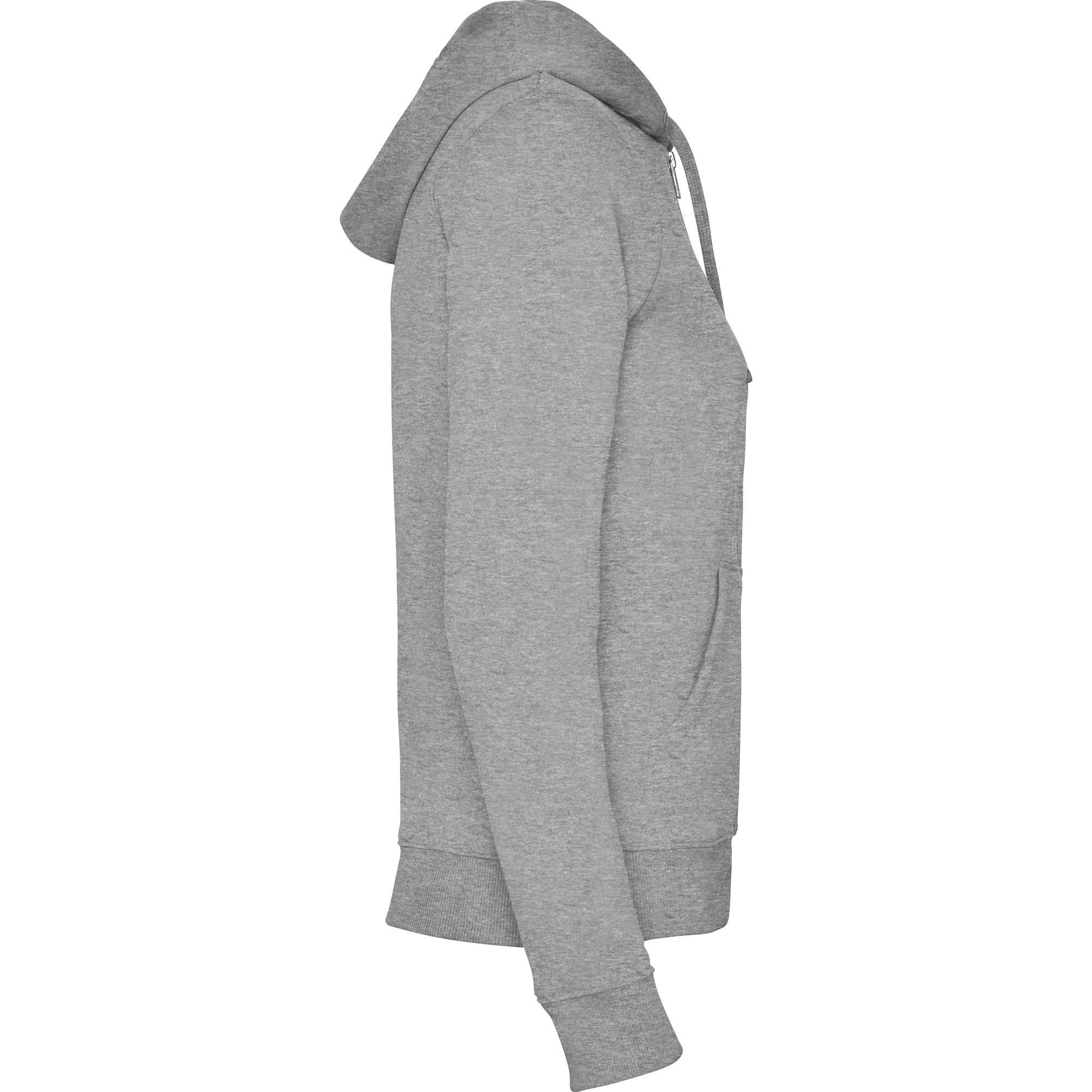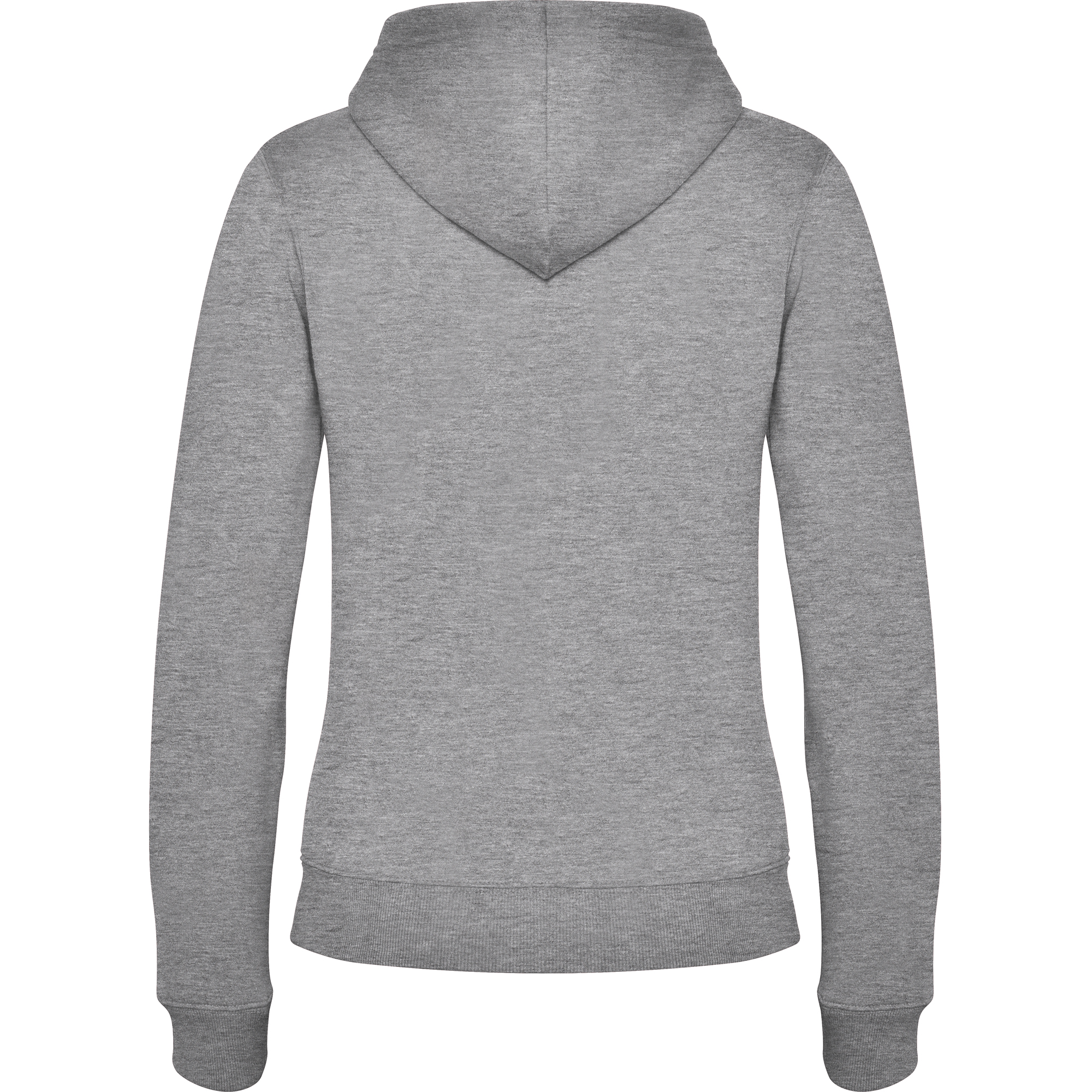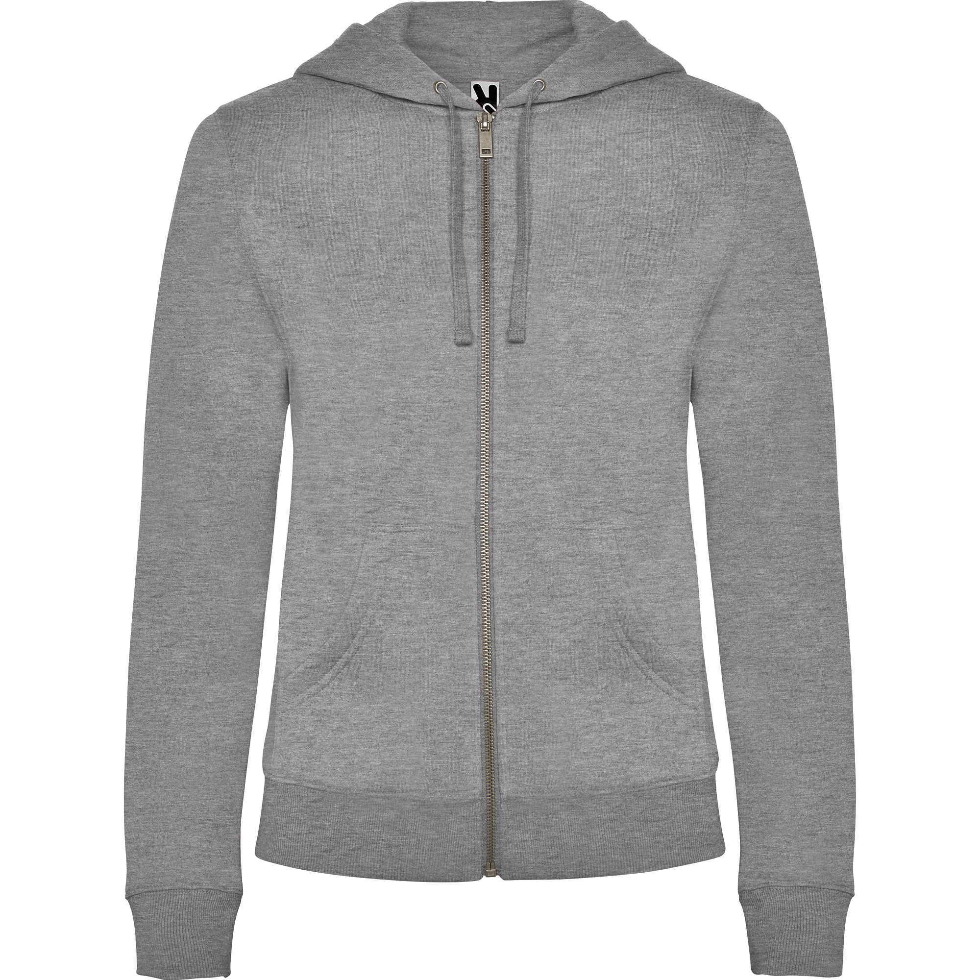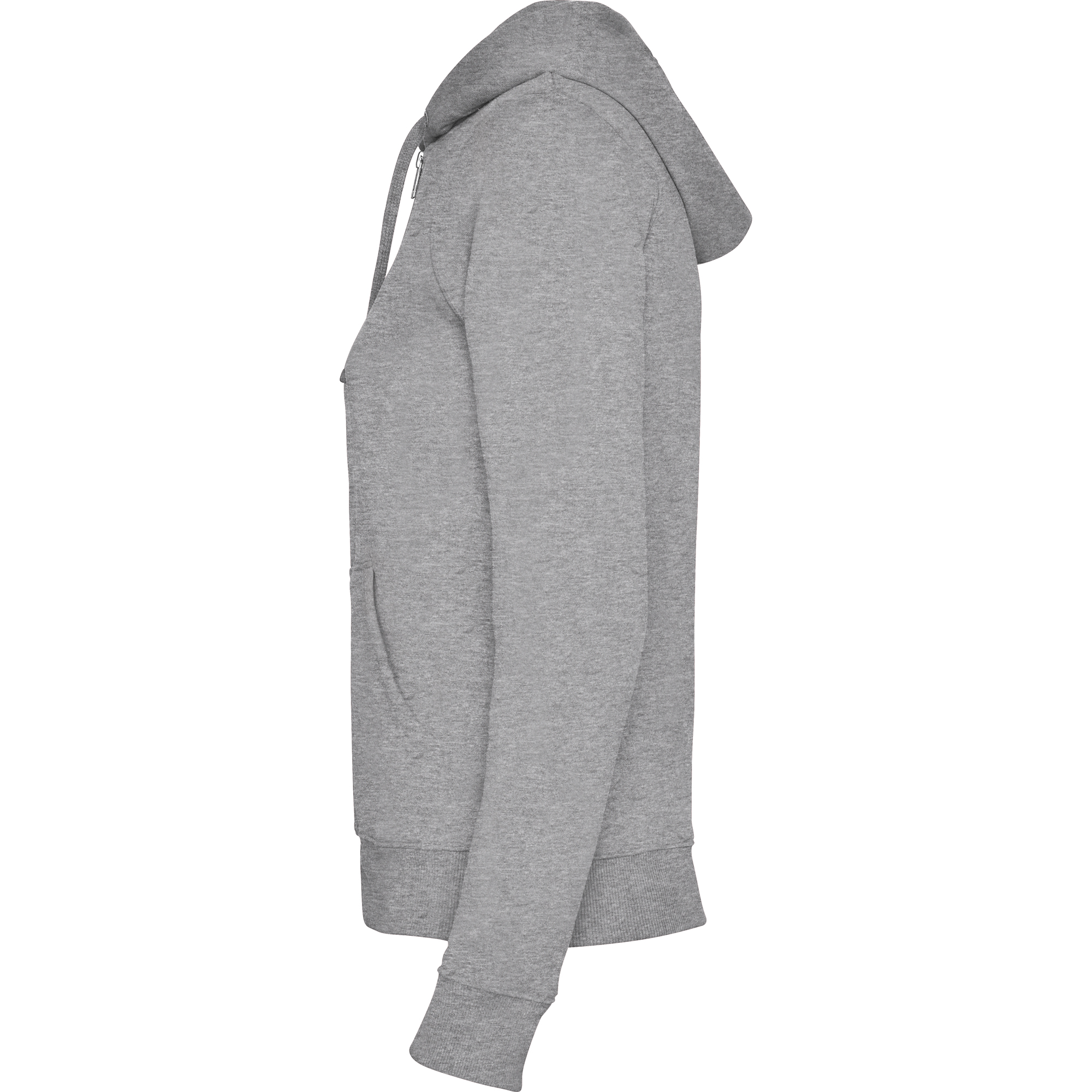Sudadera de mujer con capucha forrada a tono. Cremallera metálica frontal y bolsillo estilo canguro. Cubrecosturas reforzado en el cuello interior, corte entallado, y punto canalé 2×2 en puños y cintura.