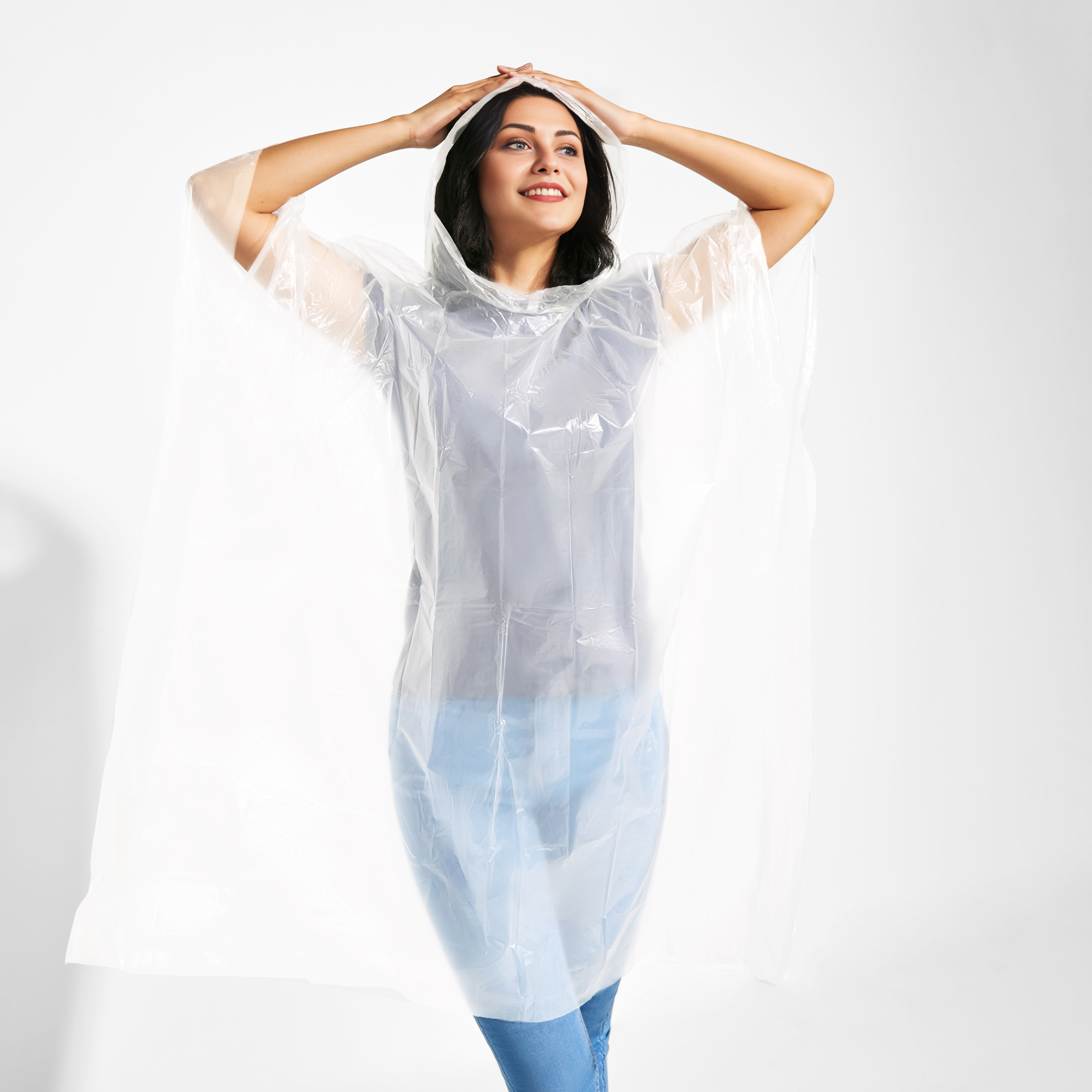Poncho para lluvia compostable. Transparente de talla única adulto, con capucha y abertura para los brazos.