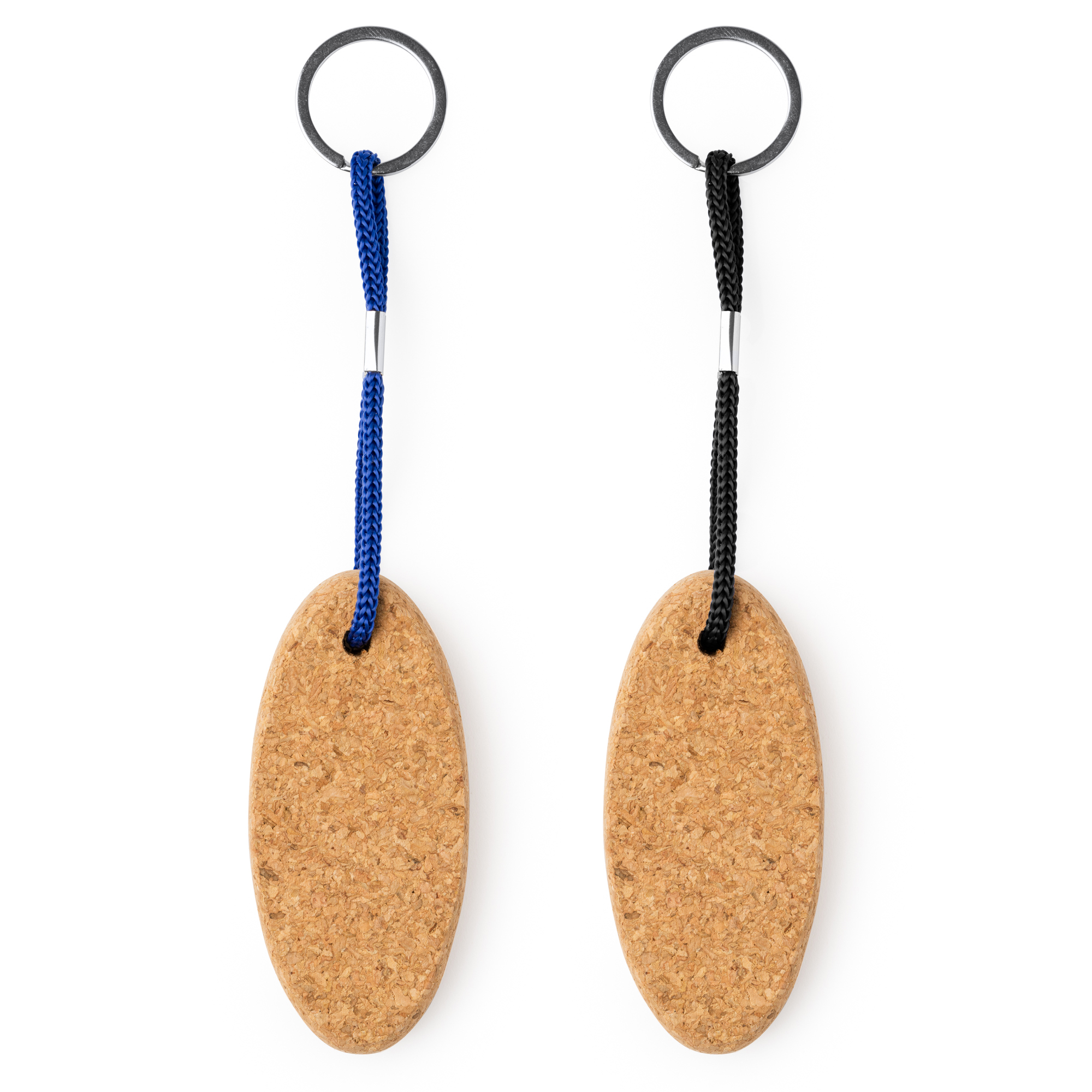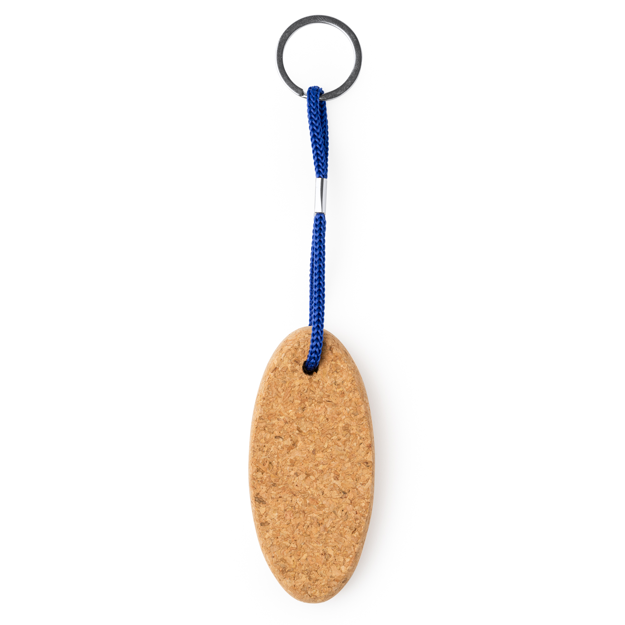 Llavero de corcho natural flotante ovalado con resistente cuerda en poliéster. El llavero mantendrá tus llaves seguras flotando si caen al agua. Un imprescindible para los días de playa.